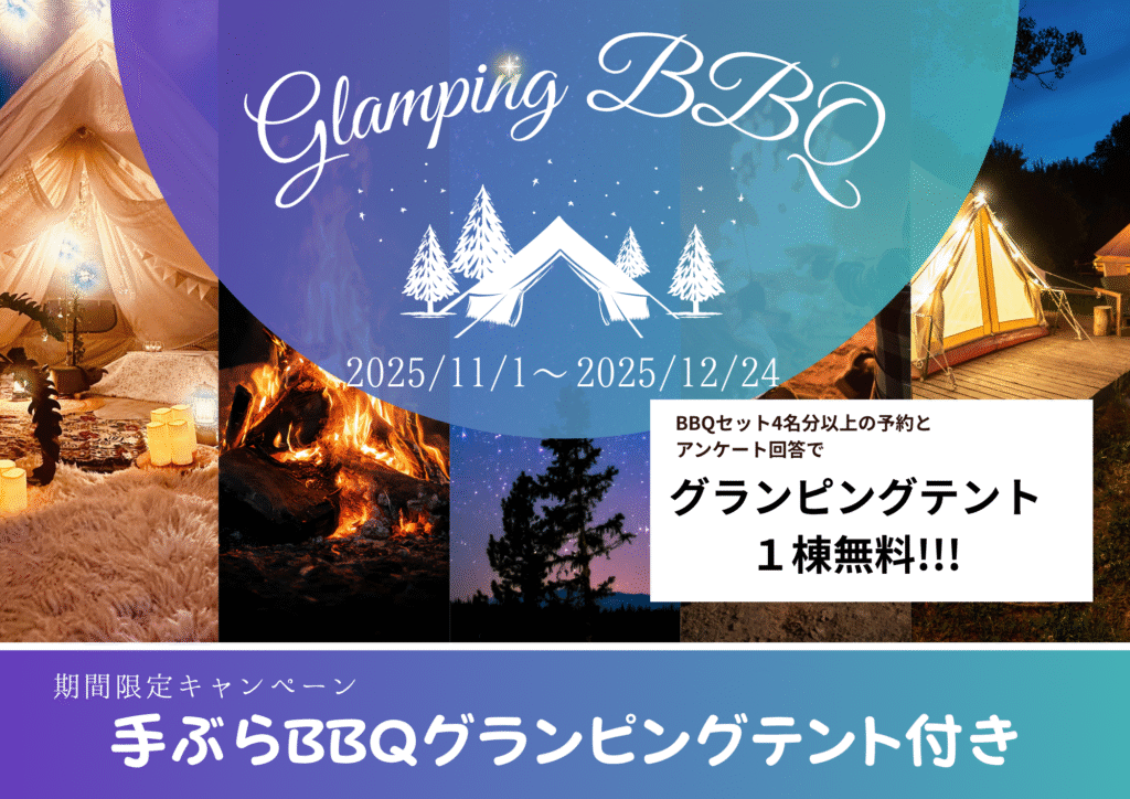 ※グランピングテント設備一覧及びBBQのメニュー詳細は下記「グランピングて当施設をご利用されるお客様」